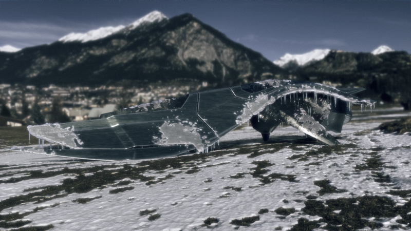 Modélisation et texture procédurale d’un vaisseau spatial, avec ajout de neige générée sur sa surface. Le tracking de caméra a permis d'incruster le vaisseau dans un plan en mouvement, tandis que le compositing a ajouté du réalisme avec des effets comme le flou d'arrière-plan, ainsi que des ajustements d’éclairage et de couleurs.