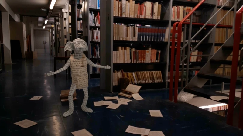 Nous avons modélisé Dobby dans le style d'un pliage en papier journal. Les textures ont été créées en scannant de vieux livres de la bibliothèque. Riggué pour l'animation par motion capture, Dobby a été intégré dans une séquence filmée dans les rayons de la bibliothèque. Le mouvement de la caméra a été tracké et l'éclairage ambiant reproduit pour une intégration réaliste.
