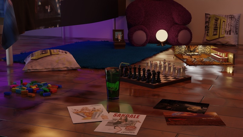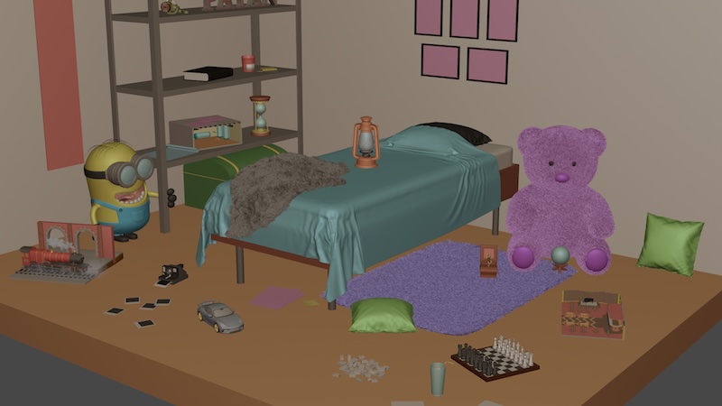 Dans le cadre d'un projet personnel, j'ai modélisé une chambre d'enfant en 3D afin de servir de vitrine pour mes autres créations. J'ai intégré plusieurs de mes projets passés sous forme de maquettes miniatures, éparpillées dans la pièce comme un tas de jouets.