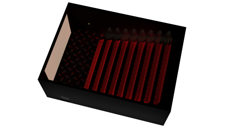 La scène a été modélisée sur Blender avant d'ajouter des textures procédurales et des images de coulure. Les plaques ont été conçues en vectoriel sur Illustrator puis intégrées à Blender. La fumée et les éclairages traversant des lentilles Fresnel modélisées enrichissent le rendu, tandis que les maps de displacement ajoutent des détails naturels à la terre et à la fumée pour une atmosphère immersive.