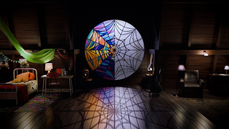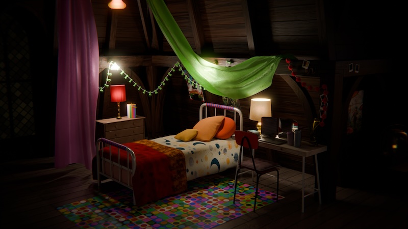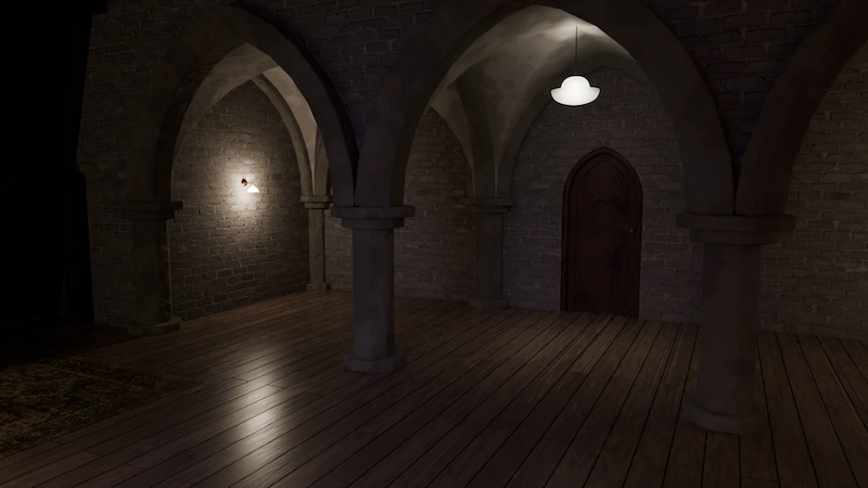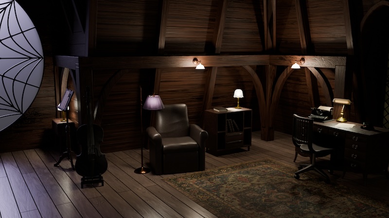 Ce projet m'a permis de me concentrer particulièrement sur les jeux de lumière, en mettant en valeur le grand vitrail central de la pièce. Chaque détail a été conçu pour capturer l'atmosphère unique de la série tout en explorant les défis techniques liés à l'éclairage dans un environnement 3D.