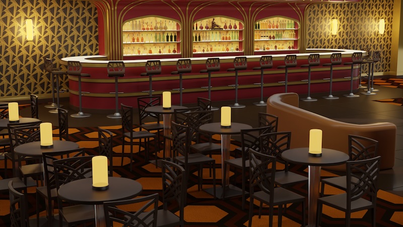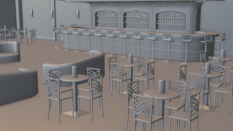 Dans le cadre d'un cours d'initiation à l'image de synthèse, j'ai modélisé le bar du film “Passengers”. Cette création comprend pas moins de 116 bouteilles, chacune reproduite avec une grande précision pour correspondre aux images du film, et placée exactement au même endroit que dans la scène originale.