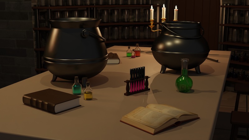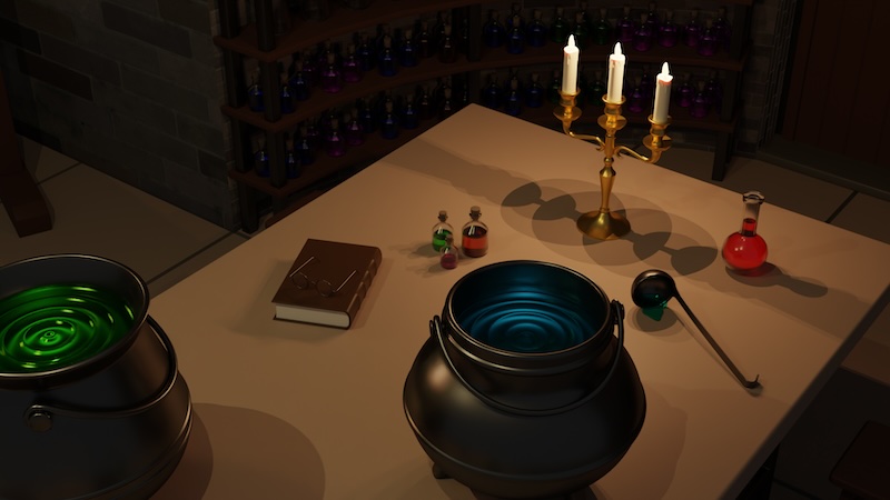 Dans le cadre d'un cours, j'ai recréé en 3D la salle des potions d'Harry Potter, en modélisant des étagères avec des fioles mystérieuses, d'anciens grimoires et les mythique chaudrons.