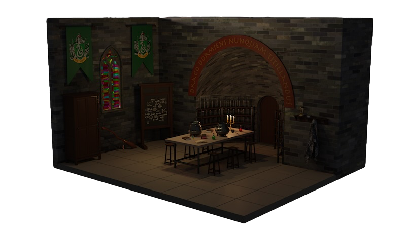 J'ai ajouté des éléments personnels, comme des fanions Serpentard, une cape d'invisibilité et un Nimbus 2000, afin d'enrichir la scène. L'éclairage et les textures ont été travaillés pour capturer l'atmosphère sombre et magique de la pièce.