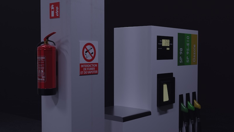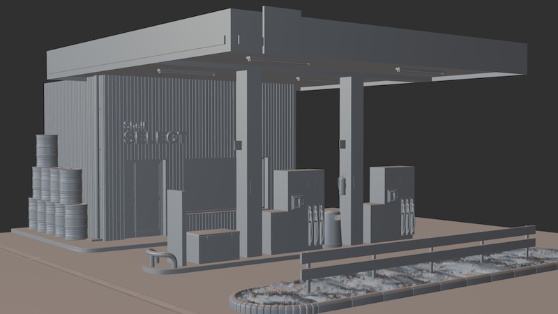 Dans le cadre d'un projet personnel, j'ai conçu une station-service immergée dans une ambiance de film d'horreur, située au milieu de nulle part. La scène se déroule la nuit, enveloppée d'une brume dense qui renforce l'atmosphère inquiétante du lieu.